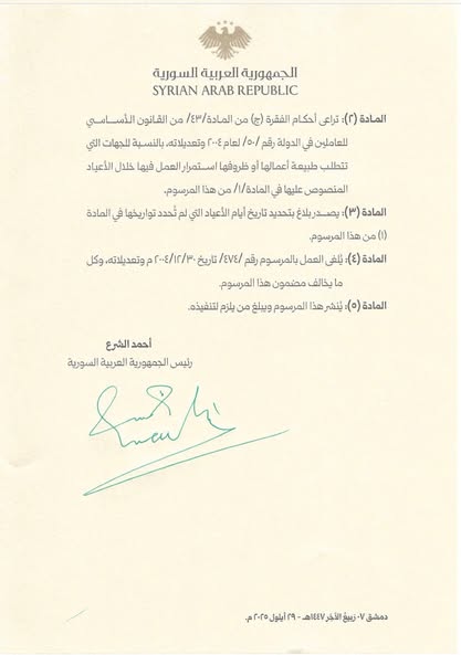 أصدر الرئيس احمد الشرع مرسوماَ يقضي بتحديد اعنماد العطل الرسمية، واضافة بعض العطل والغاء بعضها الاخر.