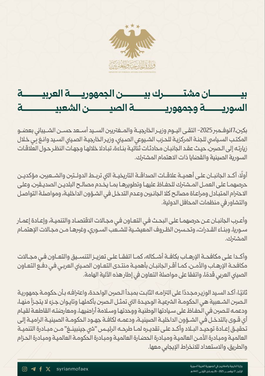 وكان قد أجرى وزير الخارجية أسعد الشيباني مباحثات مع نظيره الصيني وانغ يي في العاصمة بكين، ضمن زيارة تهدف إلى استكمال مسار تصحيح العلاقات بين البلدين وتعزيز التعاون الثنائي.