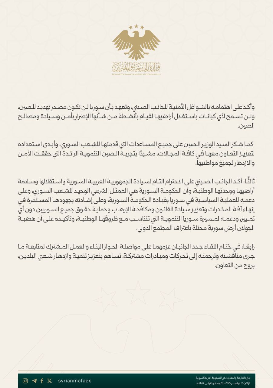 وتضمنّ البيان الذي نشرته الخارجية عبر معرفاتها الرسمية، أنّ سوريا مهتمة بالشواغل الأمنية للصين ولن تشكل مصدر تهديد لها، ولن تسمح لأي كيان باستغلال أرضها للإضرار بأمن الصين وسيادتها.