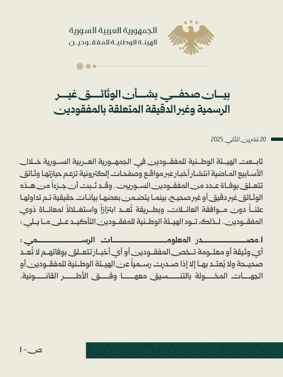 وشدد البيان على أنّ المصدر الرسمي الوحيد لأي وثيقة أو معلومة تخصّ المفقودين هو ما يصدر عنها مباشرة أو عن الجهات المخوّلة بالتنسيق معها.