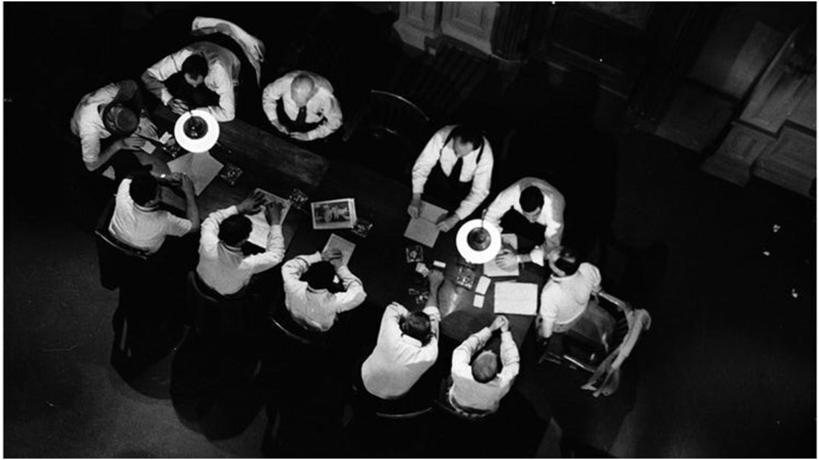اعتمد الفيلم وحدة المكان، فيما عدا دقائق قليلة فقط نجدها في قاعة المحكمة، فليس هناك كاميرا تتحرك من مكان لآخر، سوى في حيز واحد لغرفة يجتمع فيها المحلفون بعد أن توصد عليهم الأبواب بانتظار توصلهم لقرار نهائي، ولكن التصوير والتركيز على قسمات وجوه المحلفين واختلاف تعابيرهم وسماتهم بعد مداولة القرائن والشك فيها كان عالي الاحتراف؛ بقصد رصد الصراعات الضميرية في داخل كل فرد من المجموعة، كذلك الحال حين يكون التصوير شاقولياً من أعلى، يسلط عليهم الضوء مع مقعد فارغ في دلالة على أن هذا المقعد الفارغ، الذي لا يشاطر أفراد الجماعة المتحلقين حول الطاولة مداولاتهم ولا أحكامهم قد يكون عوناً للفريق بأكمله لينتقلوا لضفة الصواب، لإلغاء قرار الإدانة وإبطال حكم الإعدام، بعد أن يتخلصوا من تأثيرات مزيفة متعلقة بتجاذبات الرأي العام وتأثيرات أهوائها على أحكام الناس.