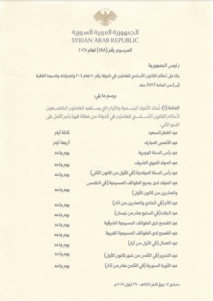 أصدر الرئيس احمد الشرع مرسوماً يقضي بتحديد العطل الرسمية، واضافة بعض العطل وإلغاء بعضها الآخر.