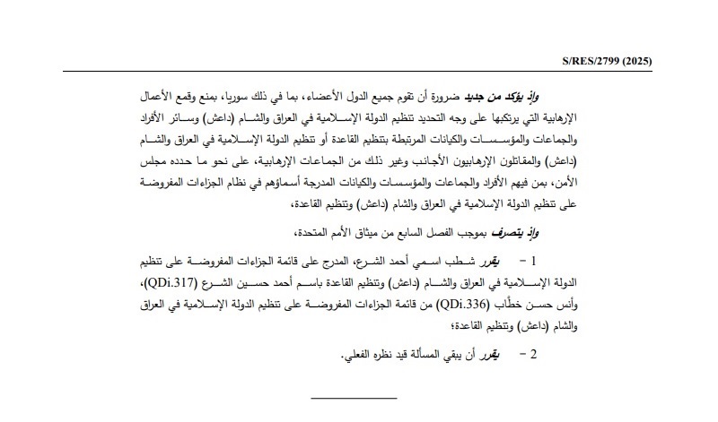 نشرت الأمم المتحدة نص القرار رقم 2799 الذي اتخذه مجلس الأمن الدولي في جلسته 10036، المعقودة في 6 تشرين الثاني الجاري لرفع العقوبات عن الرئيس احمد الشرع ووزير الداخلية انس خطاب.