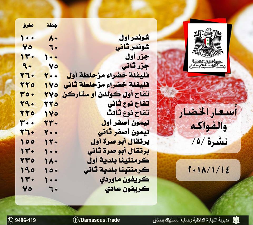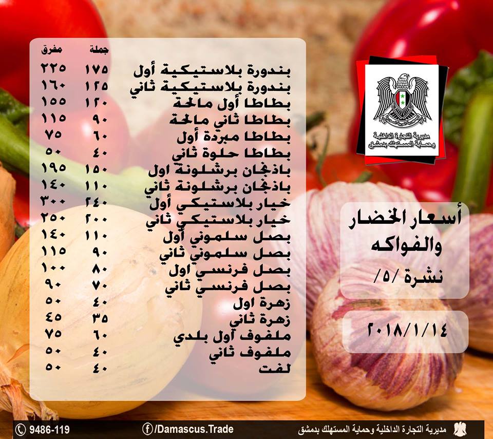 أصدرت مديرية التجارة الداخلية وحماية المستهلك بدمشق, يوم السبت, نشرة جديدة بأسعار الخضار والفواكه .
