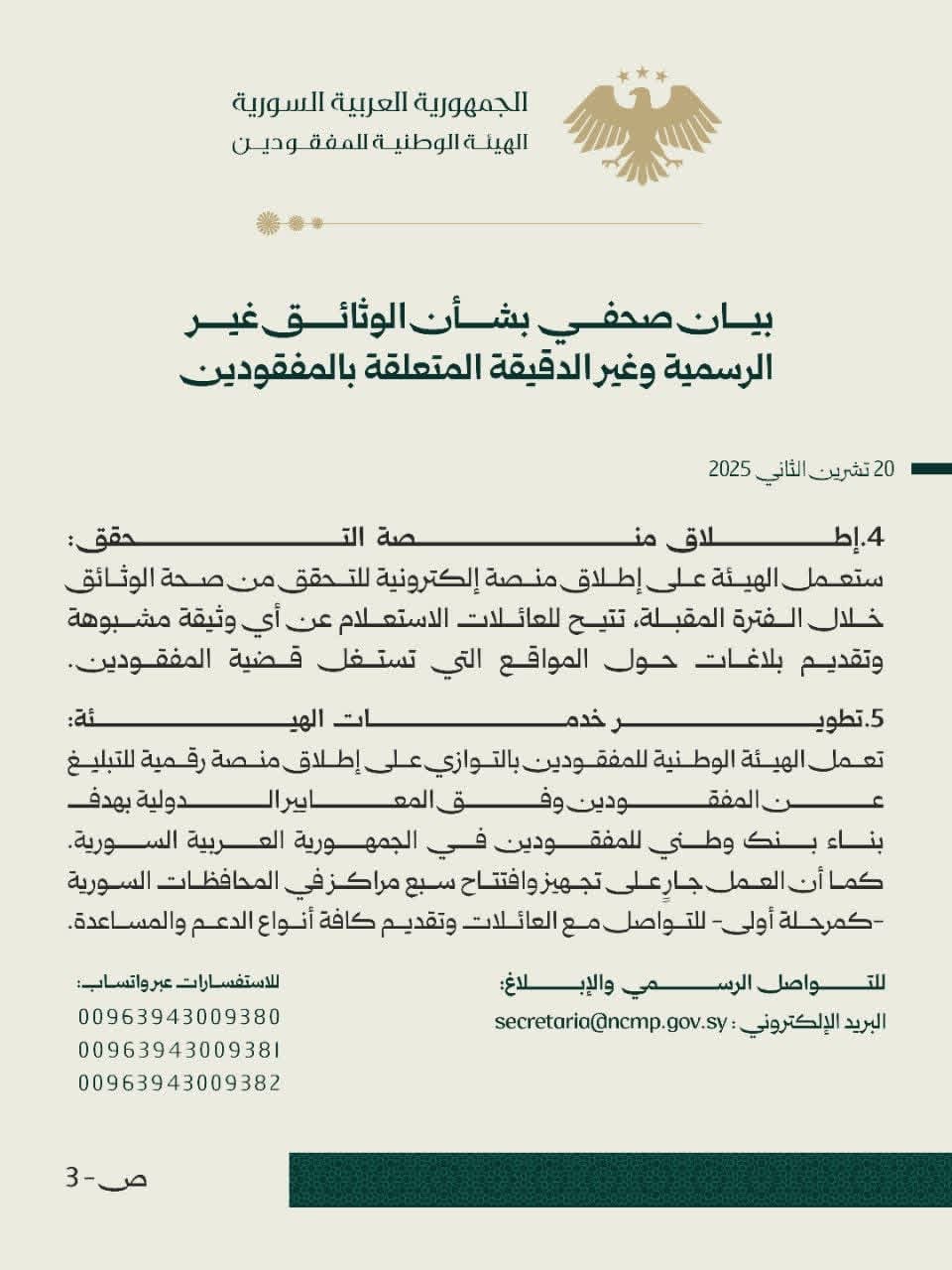 وشدد البيان على أنّ المصدر الرسمي الوحيد لأي وثيقة أو معلومة تخصّ المفقودين هو ما يصدر عنها مباشرة أو عن الجهات المخوّلة بالتنسيق معها.