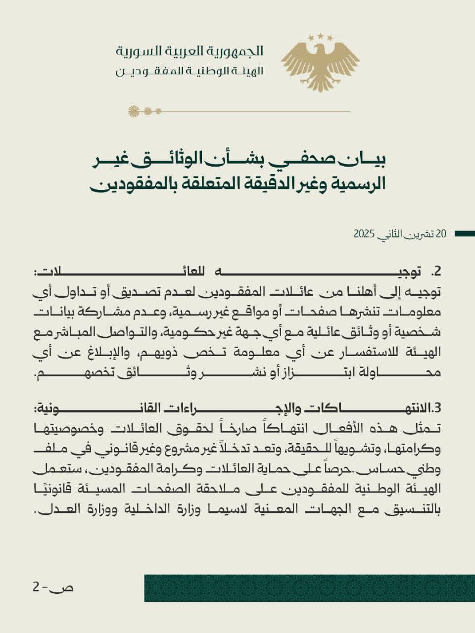 ودعت عائلات المفقودين إلى عدم مشاركة بيانات شخصية أو وثائق عائلية مع أي جهة غير حكومية، والتواصل مباشرةً مع الهيئة للاستفسار عن أي معلومة تخصّ ذويهم، والإبلاغ عن أي محاولة ابتزاز أو نشر بيانات تخصهم.
