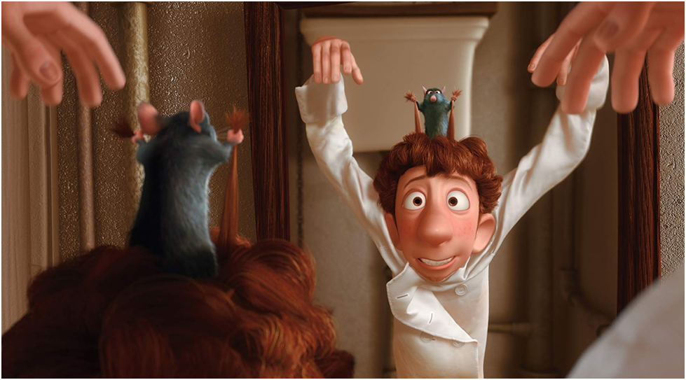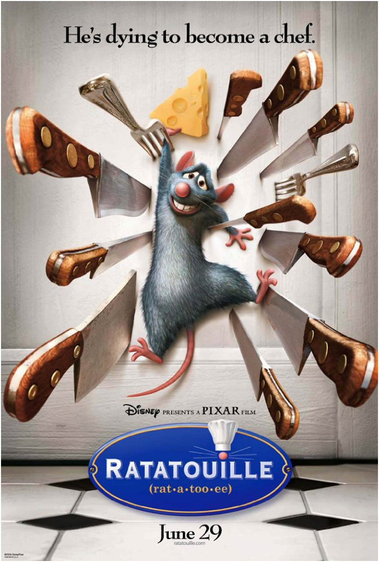 في فيلم Ratatouille ستجد أن قصة جان بينكافا Jan Pinkava مستغرقة بالفرادة والغرابة في جعلها بطلها جرذاً متحضراً وصاحب ذوق رفيع بتحضير الطعام على أصوله، وكذا إخراج براد بيرد Brad Bird الملفت للانتباه، وخصوصاً من ناحية اختيار موقع حدوث أحداث الفيلم، في مدينة السياحة والمطاعم والأنوار باريس، حيث تجتمع هناك المتناقضات، جموع حاشدة من الناس تلجأ للأكل في المطاعم، تكاد لا تجد كرسياً فارغاً في وقت الغداء أو العشاء، المدينة التي تفتخر بتنوع مطبخها وأطباقها، ولا تجد حرجاً أو إشكالاً في استضافة الثقافات القريبة في مطابخها، المدينة التي يقول عنها مختصون إن هناك جرذاً لكل ساكن فيها يسكن في أروقة المجاري أسفل المدينة على نحو مواز لحياة الرفاه والسياحة، من هناك تبدأ القصة.