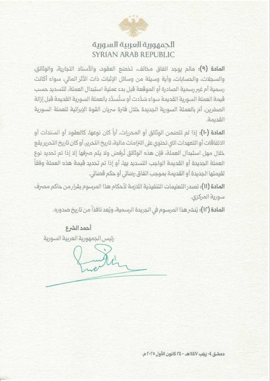 ونصت المادة الأولى من المرسوم الذي حمل الرقم 293 لعام 2025 بانه تُستبدل الأوراق النقدية السورية الحالية وتُعرف باسم العملة السورية القديمة، وتسحب من التداول ابتداءً من تاريخ 01/01/2026 م، وذلك خلال المهل التي يحددها مصرف سورية المركزي.
