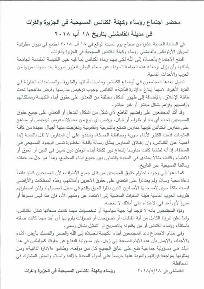 وأكد رؤساء وكهنة "الكنائس المسيحية في الجزيرة والفرات" في بيان صدر عقب اجتماع لهم في القامشلي, رفضهم القاطع "أي شكل من اشكال التدخل او التعدي على جميع حقوق المسيحيين تحت أي بند او ظرف او شكل, ورفض أي نوع من محاولات فرض تراخيص او مناهج على مدارس الكنائس كونها مدارس تتمتع بالشرعية والقانونية".