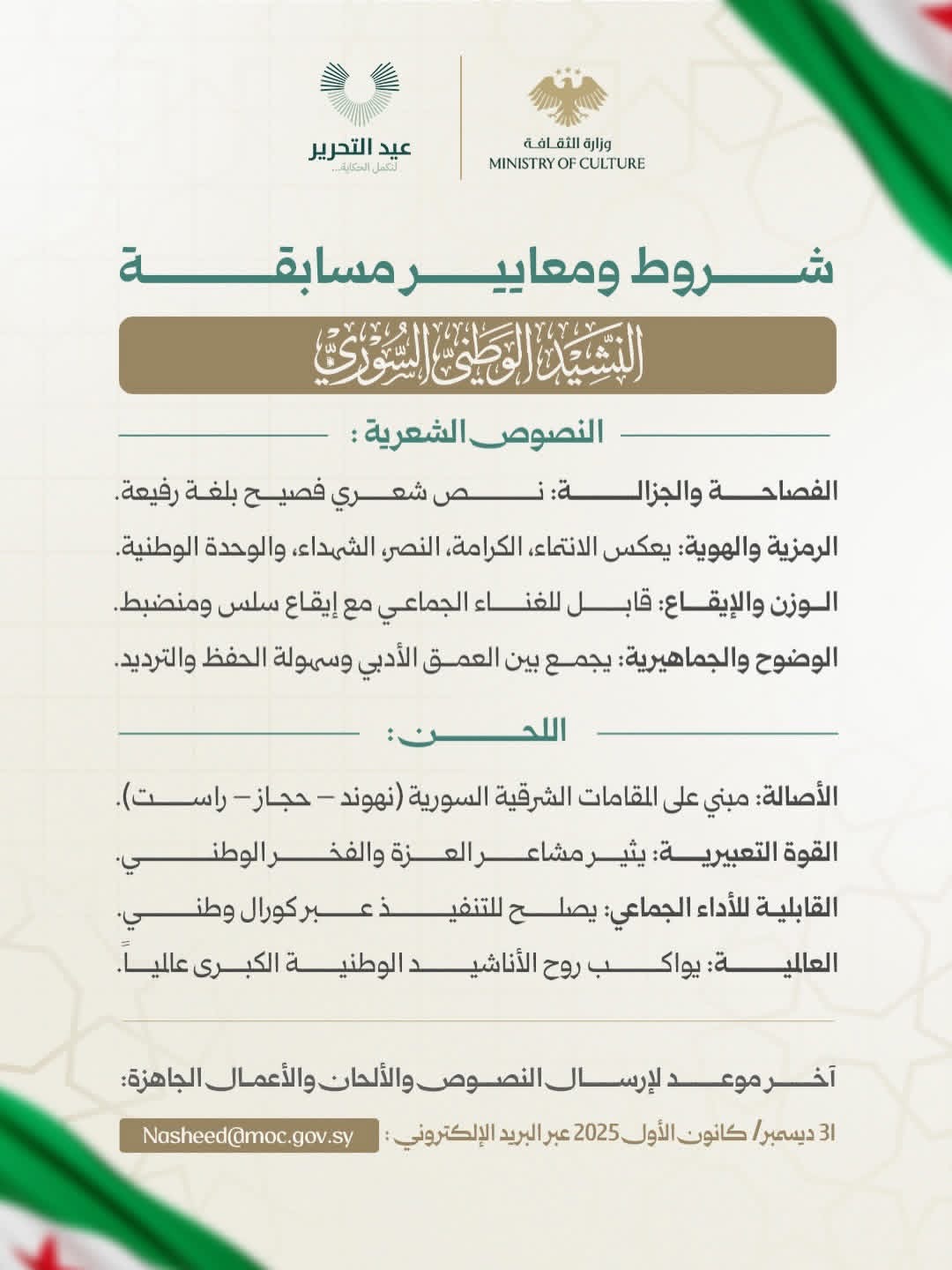 كما ذكرت الوزارة في الإعلان، أنه آخر موعد لإرسال النصوص والألحان والأعمال الجاهزة إلى البريد الإلكتروني حتى تاريخ 31 كانون الأول 2025.